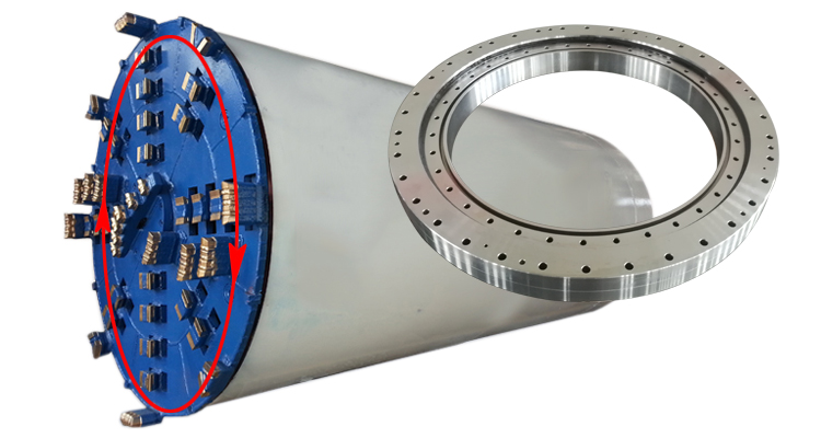 頂管機主要由旋轉(zhuǎn)挖掘系統(tǒng)、主頂液壓推進系統(tǒng)、泥土輸送系統(tǒng)、注漿系統(tǒng)、測量設(shè)備、地面吊裝設(shè)備和電氣系統(tǒng)等組成。我公司生產(chǎn)的頂管機專用三排圓柱滾子轉(zhuǎn)盤軸承(回轉(zhuǎn)支承)用于旋轉(zhuǎn)挖掘系統(tǒng)中的切削刀盤。